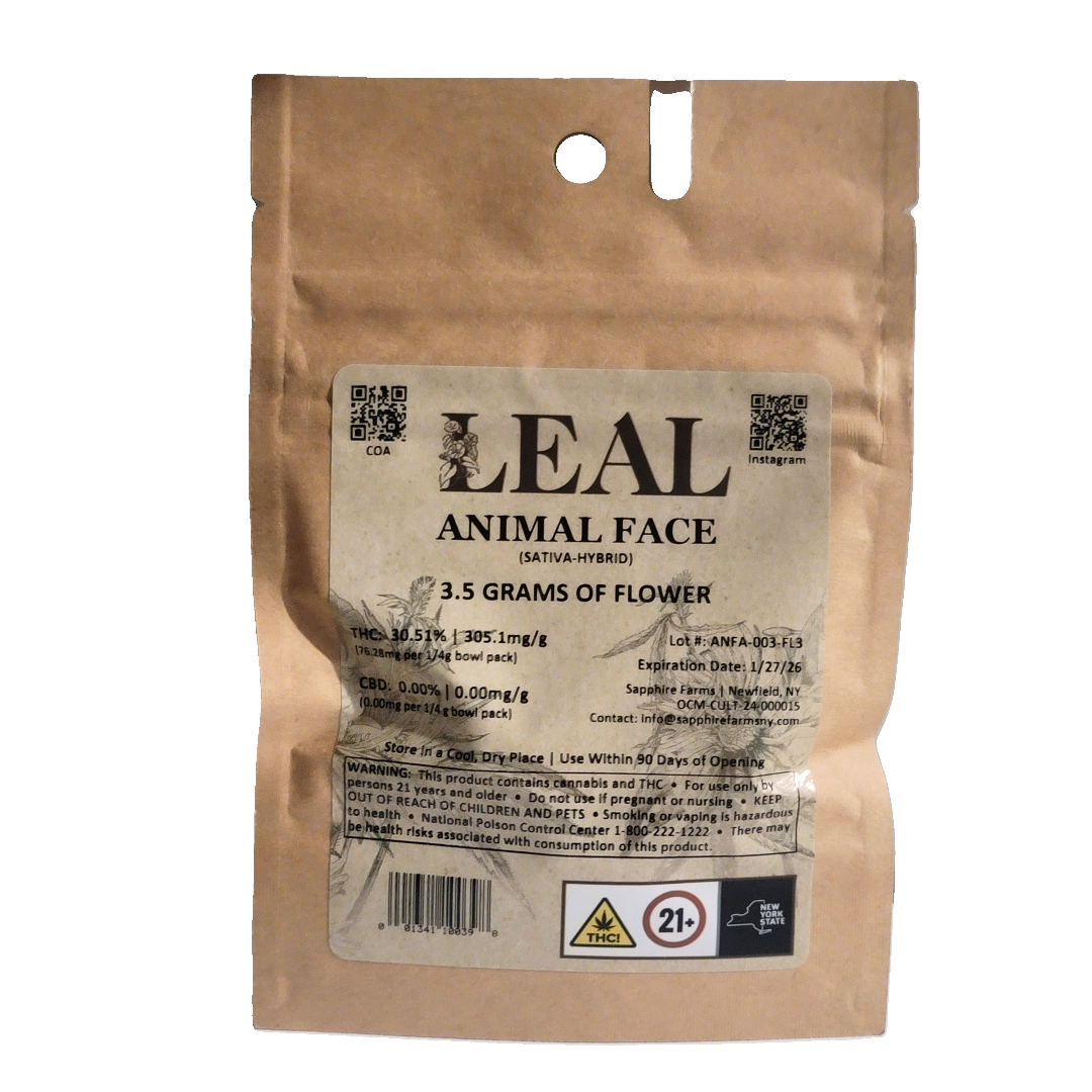 A few products consistently show up across the most locations. Animal Face - 3.5g (3 stores), Leal | Hella Jelly | Flower | 3.5G (3 stores), and Platinum Lemon Cherry Gelato - 3.5g (3 stores). The catalog skews heavily toward pre-rolls. Offerings include 491 pre-rolls, 475 flowers, 4 concentrates, and 1 cbds. Leal has built wide regional reach. Available at 57 dispensaries across Michigan and New York. Pricing lands in the premium range for cannabis products. Products run from $4.95 to $204.00.