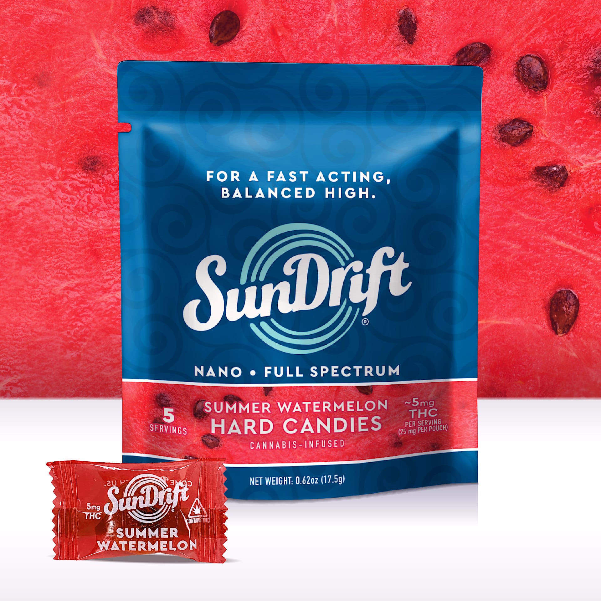 Sun Drift | Hard Candies | 5pk | Summer Watermelon | Full Spectrum | Fast Acting | Vegan | Gluten Free | Non GMO | 25mg